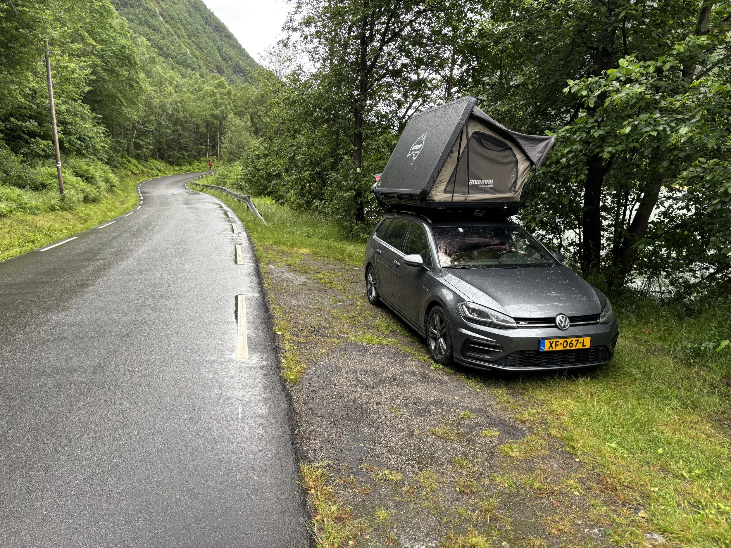 We woke up in the rain, but while putting the tent away we were mostly sheltered by the trees. The road we were standing next to had been really quiet last night so we slept well.